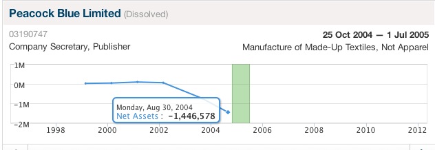Also notable from the historical data is that from 1999 until 2002, Peacock Blue is not so much a small concern as flatlining like a corpse. Yet somehow it manages to lose an enormous amount of money in just eighteen months. Not only that, but bizarrely it somehow escaped insolvency – only going into voluntary liquidation on 6th November 2010.