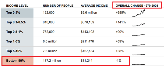 The first chart is mind-openingly simple. It shows that as American GDP has grown by 70% since 1990, household income has fallen: