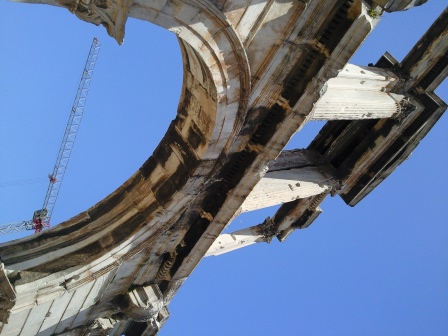 Hadrian’s Arch for instance (left) has a timeless sweep to dwarf the contemporary crane. But equally (below) the humble scaffold is vital for the restoration of noble arches. The ‘architectural’ paving and street lights that surround the overall structure, however, complement the original perfectly.