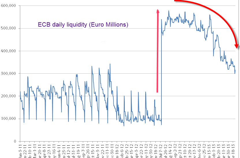 This is what happened next. The following morning, as the chart below shows, the ECB’s daily liquidity shot up from €100billion to €540billion. July 7th 2012 was a Saturday, when few if any financial folks were at their desks.