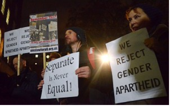 Protesting too much? As you can see from the above picture, these students reject gender apartheid. That is, separate lectures in some subject areas. You can tell that they reject gender apartheid, because the placards all say that. The only thing missing is why they reject it. In the background there is a placard which, in close-up, shows apartheid in South Africa based on race. It’s irrelevant, but it’s there. In the near foreground, the earnest chap wearing headphones holds a placard saying ‘Separate is never equal’. This is palpable gibberish, as millions of EU citizens separated by national borders are entirely equal: they are all of zero importance to their legislators.