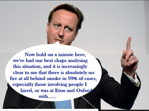 From Newscorp psychos via bullying mothers in law and bankster hoodlums to unconvicted Tory donors coughing up £34m to break bread with Cammers, there must surely come a point when even the odd Home Counties Conservative might start to question the motives and morals of the Prime Minister. Yes? No?