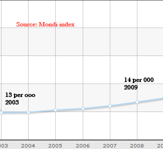 However, the plot thickens when you realise that, according to the World Bank, China reduced the poverty rate from 84% to 12% between 1981 and 2008. The country’s share of the world’s extreme poor has fallen from 43% in 1981 to 13% in 2010…and that progress has been accelerating since 2002. On top of that, China has of course applied a ‘one child per family’ diktat for many years. Now look what happens to the birthrate per 000 population between 2003 and 2009:
