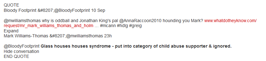 At other times, it is those lacking common sense who display this defect by trying to cover up evidence of it. Harriet Harman and her husband the unpleasant Jack Dromey are constantly engaged in trying to airbrush a past riddled with unwise beliefs. So too is Mark Williams-Thomas, a man who routinely bigs up his qualifications, and always refers to himself as a criminologist – despite the lack of credible evidence that he is any such thing. But again, here we have a bloke who is a serial self-publicist, who makes money from his crusade, whose advised prosecutions invariably fail, and who appears not to know the difference between libel and slander. A man who libelled DLT on Twitter immediately after his acquittal, but then took it down when advised it was highly actionable. A man who describes himself as professional (which he spells ‘progressional’) but then tweets hugely libellous crap like this: