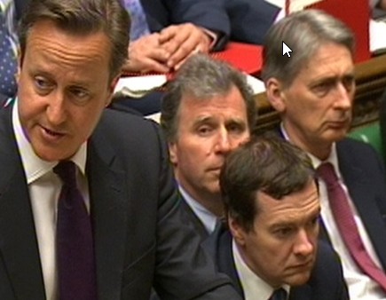 This shot was taken in the House of Commons about twenty minutes ago (12.04 pm BST). If one had a suspicious nature, one might be forgiven for thinking that things are not quite as rosey as we’re being led to believe. Clockwise from the left, these chaps are responsible for the Realm, the Tory Manifesto, Defence and the Money. Defence Minister Philip Hammond, however, does – I’m sure you’ll agree – have a rather fetching arrowhead grip in his hair….about which I think we should be told more.