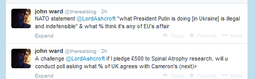 Yesterday, David Cameron blaséd his way through a Commons NATO statement, the Ukraine-related part of which led him to make statements I’d imagine many British people do not trust. So I was thinking afterwards that here we have a shifty Prime Minister distrusted by a shadowy political billionaire donor: is there something that could be done with this? Could Cameron be embarrassed – and some good be done for democracy – involving Lord Ashcroft Polls?