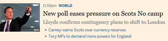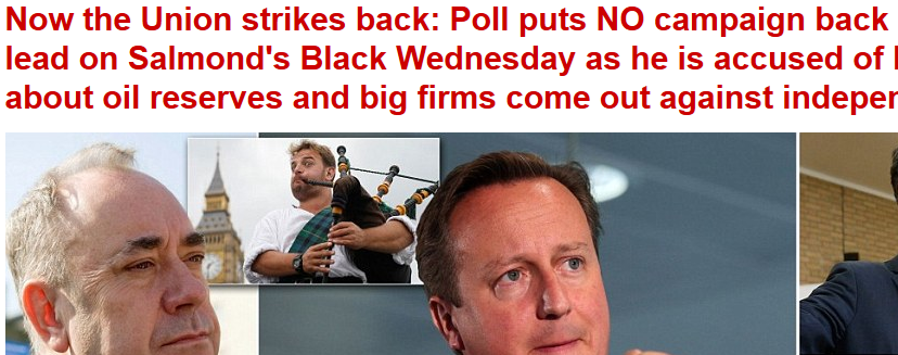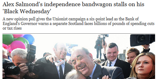 Having quite blatantly censored yesterday’s Barker Poll showing an 8-point lead for the Scottish Yes campaign, this morning the Maily Twinnograph Daily Telegraph trumpets a new one from its front page. This new Survation poll shows the No campaign “back in front” with a 6-point lead, suggesting that the Yessers “have peaked too early”. It was “Black Wednesday” for Slippery Salmond said the Sarkograph.