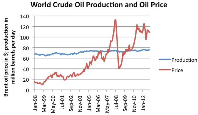 crudepriceObviously, the plunge of 2008/9 is directly linked to Bank Bailout on Wall Street. But from 2008-10 it zooms back up again, and blips down again in 2012. Production remains remarkable steady throughout the saga.