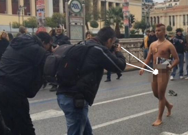 greecedickptnetUsing techniques pioneered by the Kennedy Assassination team, you can see here how I have pinpointed the exact camera lens lines of the two snappers who are obviously keen to record the quintessential substance of the demo for next week’s Kathimerini Spot the Balls competition.