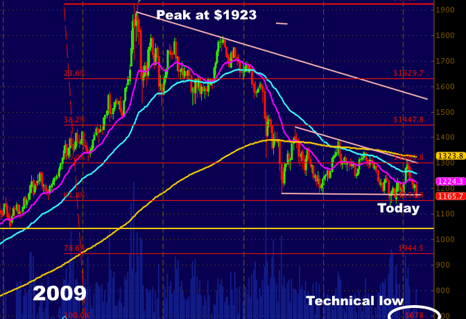 In just five hours of trading yesterday afternoon CET, gold fell 2.6%. At the the close of play, it stood at $1168.2. There was no discernible rally: it just went ‘wump’ – right off the cliff, the minute the NYSE opened.