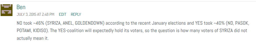 The eurogroupe is desperate to tell Greeks that tomorrow’s referendum is an In/Out of the eurozone plebiscite. Bild Zeitung thinks it’s about whether Athens should declare war on Germany and gratuitously bankrupt the world. The New York Times insists it’s a vote of confidence or otherwise in Alexis Tsipras. Brussels Parliament Chief Dummkopf Bernhardt Schulz says it’s about whether Communist lunatic dictator monster Tsiprasovitch should be instantly replaced by more knowledgeable technocrats. And Yanis Varoufakis (the swine) is playing the dastardly empirical card by saying it’s about whether Syriza was right or wrong to turn down the eurogroupe terms that have now been taken off the table.