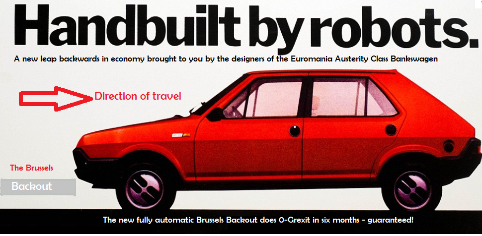 Designed in a newly constructed factory in Stuttgart using Turkish robot androids, the new 6-reverse-gears Backout launches today, and will cater for all Greek visitors. Uniquely, it promises free travel for all German, Dutch, Belgian and Greek élite carpetbaggers, plus 100% fuel economy for accredited Troikanauts and that’s a promise: yes, thanks to the advanced bloodsuck feature developed in Cyprus, absolutely no fuel will be wasted on the Greek economy – paving the way for a new era in Transnational High-Efficiency Fukyoo Transactions or THEFT.