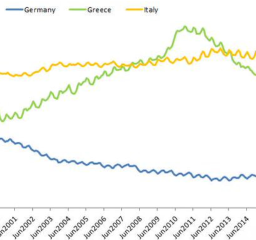 Nobody – but nobody – has done as well out of the euro as Germany. Whereas the vast majority of eurozone members experienced a revaluation upwards of the currency as a result of adopting the single currency, changing from the Mark to the Euro represented a steep devaluation of its trading currency for Germany. Below we see this graphically represented against the two big ezone basket cases, Italy and Greece: