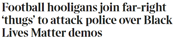 This one was obviously given to a trainee robohack, upon which to cut his teeth. It shows that – as yet – his dentistry lacks that certain Great White cutting edge….but he’ll learn fast, and it wasn’t a bad beginning: ‘Murderous soccer Nazis join fascist scum to attack defenceless police officers and besmirch BLM Heroes’ would’ve been closer to the mark.