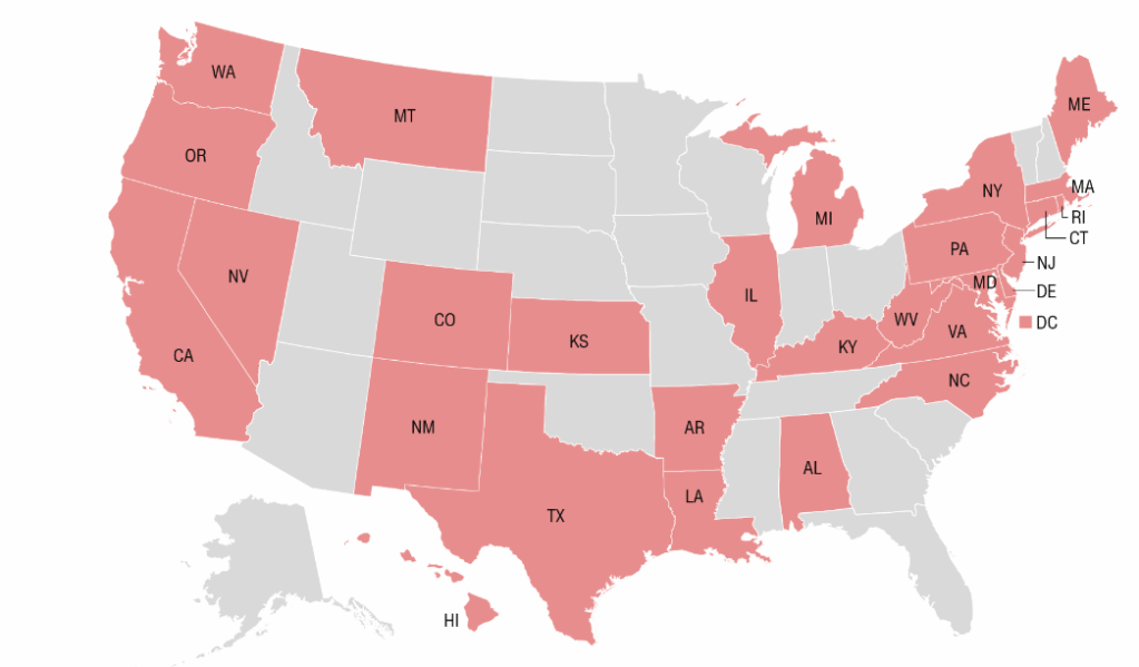 Further still – and truly astonishing – is this map showing those US States (dark pink) where masks in public are now mandatory: