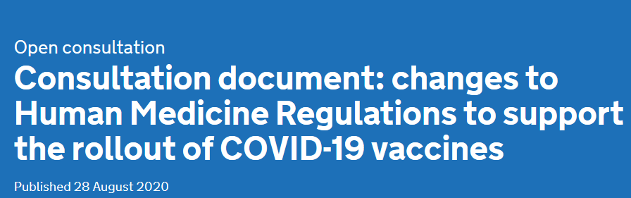 ‘The UK government is seeking views on proposals to make changes, in conjunction with the Minister of Health in Northern Ireland, to the Human Medicine Regulations 2012. These changes will support the effective rollout of a COVID-19 vaccine and the upscaling of influenza (flu) vaccination programme in the UK. It is important to emphasise, however, that although some of the measures specifically reference COVID-19 and flu vaccines, the proposed changes will also facilitate the efficient mass distribution of treatments for COVID-19, or for any other disease that poses a serious risk to public health.‘