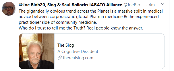 I’m starting tonight with this page capture from today’s Twitter Games in the Amphitheatre, because (while the above was merely a heartfelt reply to a good-hearted but clearly miserable doctor-practitioner) I do think the split I refer to is at the centre of the virus dilemma.