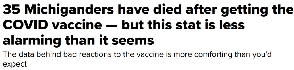 So then, 35 Michiganders have died immediately following vaccine injection, but don’t worry – it’s just another of those kooky statistical coincidental glitches that we Covid heroes come across now and then. And sure, 35 is 35 more than zero, but weird stuff happens so don’t be alarmed.