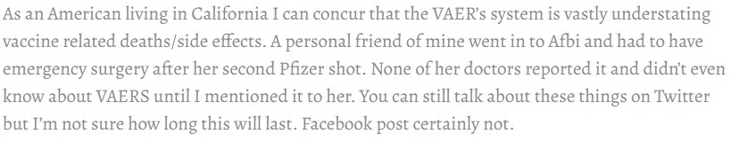 This is the story: until just over a week ago, there was a Facebook group dedicated to UK deaths and severe adverse reactions following vaccination. It got to well over 135,000 detailed reports when, without warning or yellow cards, FB deplatformed the group for ‘not conforming to their user policies’. The group’s output contained not just testimonials from family members, but also scanned death certificates, videos, and photos.