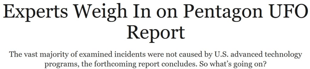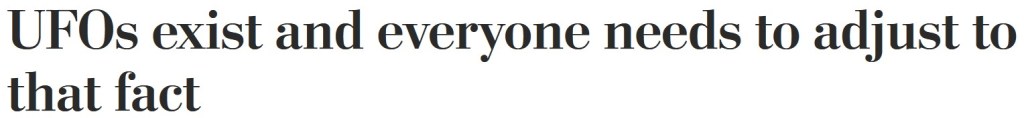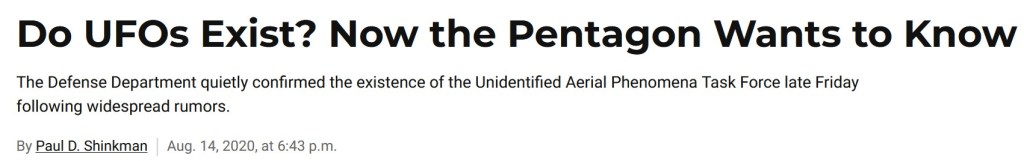 The Pentagon wasn’t “quietly confirming” anything….it was encouraging belief in “a serious threat”. Not an invisible bug or a unnoticeably rising sea level this time – but something unearthly. Today, after 75 years of ridicule and denial, Aliens have come of age on NBC: