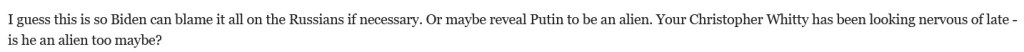 Clearly, my chum’s not impressed. As ever, he’s fairly cynical. For myself, I’m in the odd position of both finding alien visitation possible* and the Surveillance State working hard to rewrite a narrative highly probable.