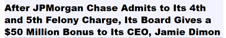 ‘Over the last seven years, with Chairman and CEO Jamie Dimon at the helm, JPMorgan Chase has managed to do what no other federally-insured American bank has managed to do in the history of banking in the United States. The bank has admitted to five separate felony counts brought by the U.S. Department of Justice, while regulators took no action to remove the Board of Directors or Jamie Dimon.’