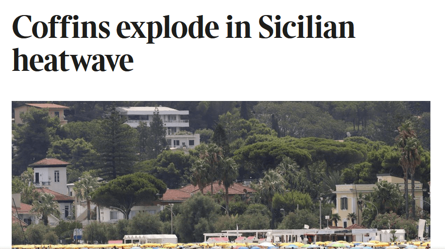 This is a masterpiece of eclectic harem-scarem from The Times this morning. Because of global warming, it’s so hot in Sicily right now, the dead are being explosively decoffinated – creating a massive potential health problem, and because of the deadly killing machine Covid19, there’s no time to bury the coffins OMG OMG OMG.