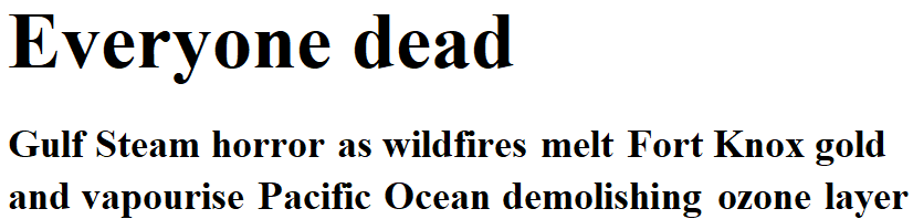 That’s a peachy one, because it gets everyone out of jail: no more Geli Merkel ringing Jerome Powell to yell, “Wo ist mein verdammtes Gold, Arschloch?”. Aw shucks, little Sausage – that pesky climate change did for it…what a bummer, huh? New emergency powers are brought in to use the empty Pacific basin as a mass grave for Cytokinic victims, and everyone but the Davos folks under their Klingon climate bubble dies of skin cancer. Job sorted, no conspiracy theory to see here: “It’s a tragic disaster,” says Just Intrudeau, “but we did warn you so ner ner ne ner ne, worms”.