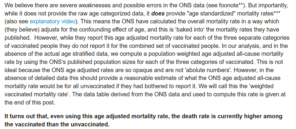 If you’re a glutton for punishment (the above is a page capture) you can find the full account here – or, you can accept my bottom line: the imputation of this duo’s findings – with no axe to grind – is that the ONS demographic criteria for the vaccinated by age are “opaque” but even accepting that, as the penetration of vaccination in the UK populace has increased, vaccinated death rates are now HIGHER than among the unvaccinated: