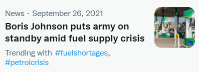Note that Twitter has already given ‘trending’ status to ‘fuel shortages’ and ‘petrol crisis’ – neither of which are true. It’s more fear, and it’s in the media and, well, ping my blog – how or why on earth could that have happened?