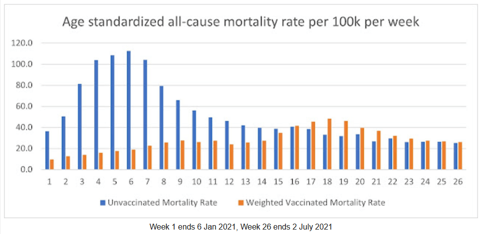 In short, the orange and blue columns above show that what was once a Covid virus problem is now a vaccination problem, because the latter is an equally likely form of death.