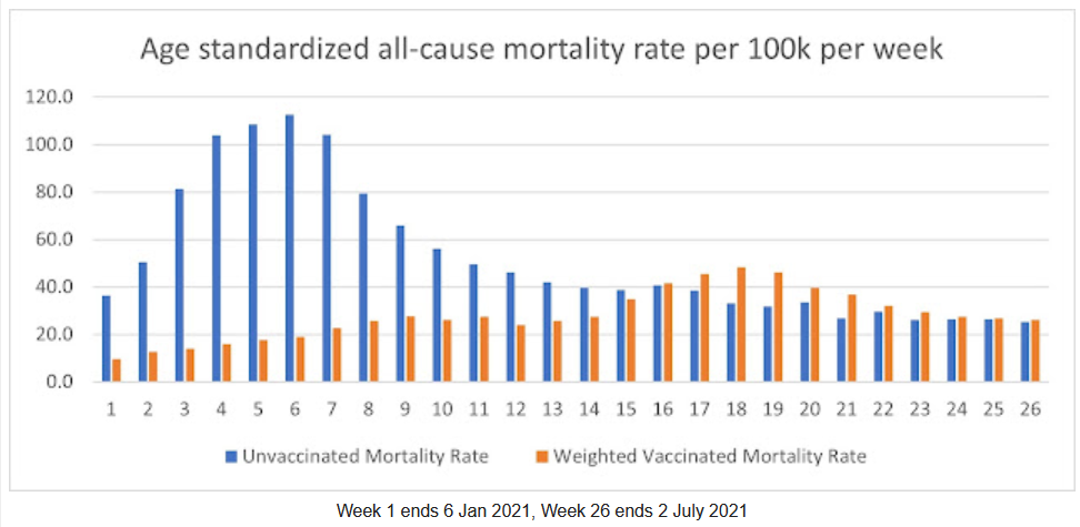 In short, the orange and blue columns above show that what was once a Covid virus problem is now a vaccination problem, because the latter is an equally likely form of death.