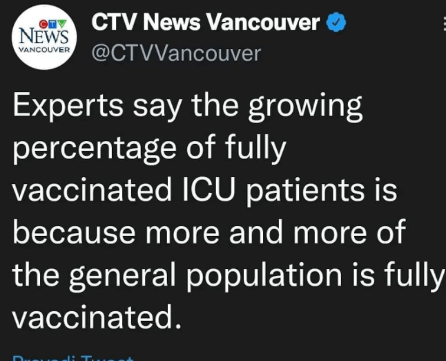 So what do we have here, to your right? Well, it seems Simple Simon went on to great success as a CTVNews hound, trotting out verbatim the idea that more fully vaccinated sick folks are to be found in hospitals because more and more people are fully vaccinated. The only flaw in this latest incarnation of “expert” opinion is that if an anti-Covid “vaccine” is working (shall we say) at full throttle, it didn’t oughta result in them winding up in hospital with Covid….or indeed, with side-effects from the “vaccine” billed as the “antidote” to Covid that didn’t actually turn out – in reality, at the end of the day and all things considered – to be an antidote so much as an anecdote about safety and effectiveness….as peddled to a wide-eyed populace by M. Hancock, A. Fauci, C. Whitty, P. Horby & Partners.