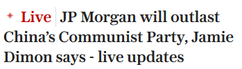 This is what passes for journalism at the Telegraph right now. 3 or 4 hacks are trying to question the agenda, but they’re outshouted by the rest of the dross. I’m not sure what to do with this one, the gist of which is to suggest that, somehow, JP Morgan’s values are preferable to the PRC politburo’s. On the whole, I’d suggest it’s not much of a choice: on a par with ‘Feeding Christians to lions will outlast Emperor Caligula says Lion’ perhaps, or ‘Cannibalism more nourishing than Veganism says Idi Amin’. It sort of makes you want to ask, “What else yer got?’