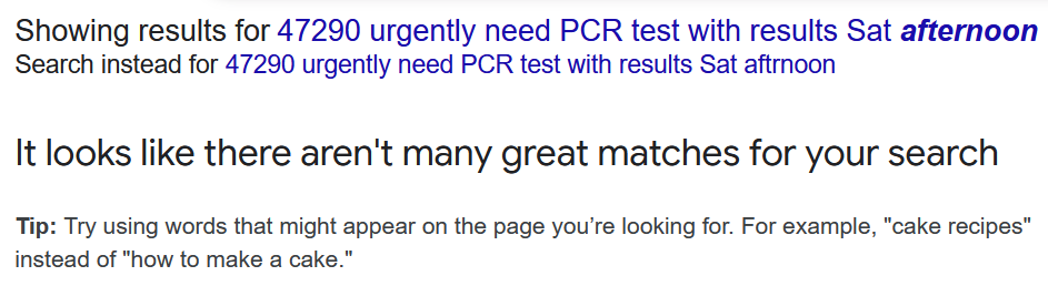 This refers to a PCR test I need in order to be allowed onto a flight this coming weekend. I used my postcode because that’s what the “Government’s” official Covid test site suggested. I particularly liked Google’s AI suggestion about cake recipes, because it put me in mind of Marie Antoinette and “let them eat cake”.