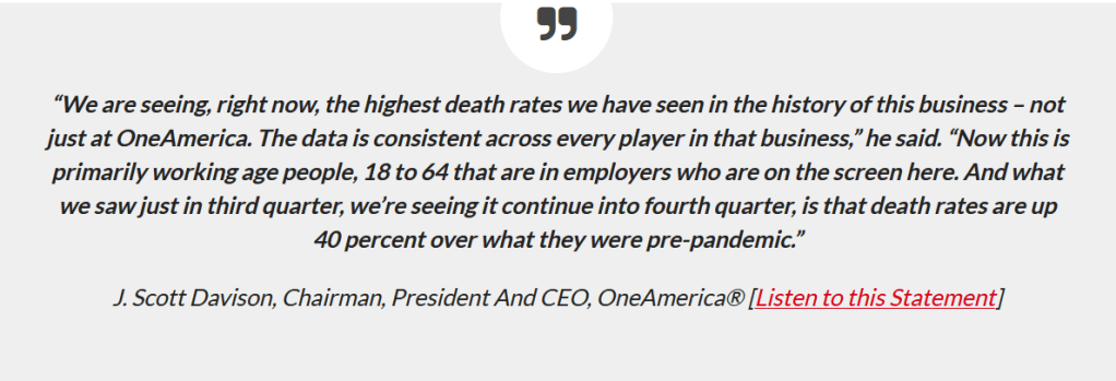 Before you start snorting behind your hand at this Wild Conspiracy Theory, let’s examine the statement of American insurance CEO J Scott Davison of two days ago in relation to “Covid deaths”. Try to do this through the usual channels, and you’ll be greeted by this: