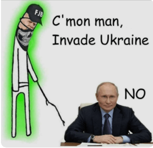 As this pertinent cartoon (left) indicates rather well, the BIDENEUNATO narrative is about as IABATO as it gets*. The Russian troops are where they are to deter NATO from playing silly buggers in Ukraine, and the Pentagon/State/CIA attempt to poke Putin into doing something he doesn’t want to do is doomed. Our Prime Minister is thus flying to Kyiv to show that by being tough, he can have no effect on Vlad whatsoever, and thus claim some kind of hollow victory.