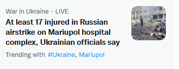 Volodymyr’s considered verdict on Vladimir seems to be based on the dastardly airstrike upon Mariupol Hospital. Unfortunately, the attack is only verified by, um, Ukrainians – chaps who are on the whole unlikely to mention Zelenskyy’s known habit of firing rockets from schools and hospitals….a little trick he learned from Hamas. C’mon Twitter – time to get those fact checkers on the case.