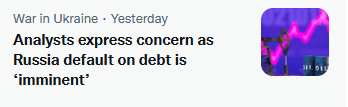 Nihil desperandum NATO, because Twitter has found out from ‘analysts’ that a Russian default on its debt is “imminent”. Every newspaper crawling up the arse of the Dystopians has been talking to the same analysts, and spookily they’re all anally retentive analysts in perfect lockstep using ‘default imminent’. Perhaps they’re psychoanalysts.