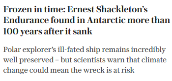 Talking of which, are there any clues to guide us on the vexed subject of what the puppeteers have in store for us next on the Oh My ArmaGodden terror front? I’d say yes, there is: the Earth’s on f-f-f-f-fire junk they were flogging last summer. Their starter for ten today is to warn that Ernest Shackleton’s lost ship has been found, but that pesky climate change is still at its evil work.
