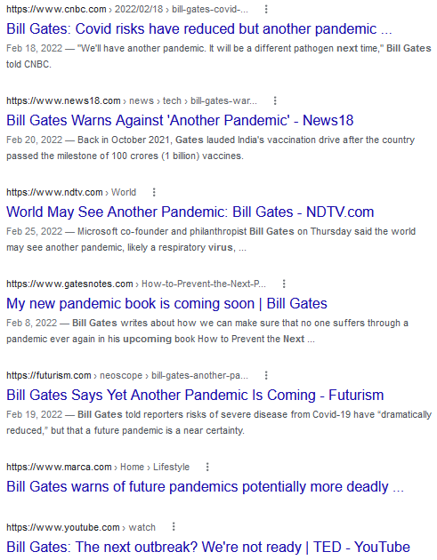 Little Billy Gates has been making more of his startlingly accurate Old Moore predictions in the last few weeks. On February 8th, 13th, 18th, 19th and 25th this year, the founding (and only) member of the Jeffrey Epstein Admiration Society told every medium and its mother how something much worse than Covid19 was coming very soon.