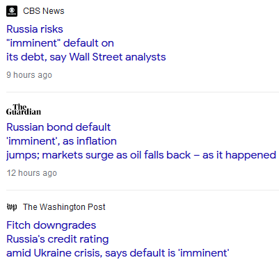Nihil desperandum NATO, because Twitter has found out from ‘analysts’ that a Russian default on its debt is “imminent”. Every newspaper crawling up the arse of the Dystopians has been talking to the same analysts, and spookily they’re all anally retentive analysts in perfect lockstep using ‘default imminent’. Perhaps they’re psychoanalysts.