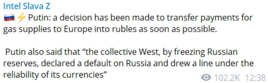 This is a less than veiled reference aimed at Germany and Brussels, basically saying “If you want all my debt to be dollar-denominated, then you’ll have to pay for your gas in roubles”. He is reiterating what I wrote here two days ago: if you want me to default, then fine – bring it on – I’m not going to pay in dollars if you freeze my assets….but you’ll be left with the bill, not Washington”.