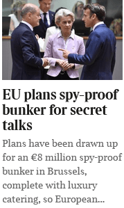 The article goes on to stress that the bunker will ensure ‘European Union leaders can hold secret talks over dinner without the Russians listening in….Crucially for Europe’s leaders, who have come to expect a certain quality of food, wine and other refreshments, the chamber will ensure a “suitable level of comfort for VIPs” under plans seen by the EUObserver website…..The new chamber will be enclosed in a military-grade insulation cage certified by Nato to militate against the risk of “compromising emanations”’.