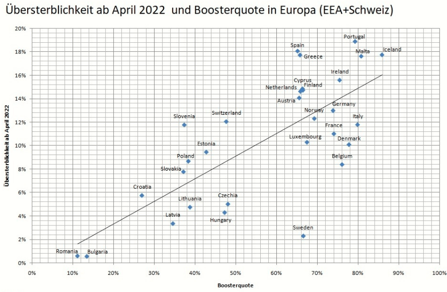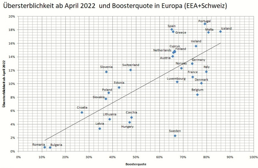 Giving you a quick intro avoiding Google-translate at all costs, the chart measures excess early death mortality in the context of vaccine booster quotas achieved by European countries.