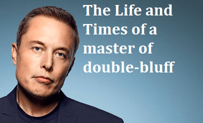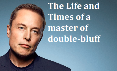In the late teens of this our troubled century, Elon’s larking about got him into trouble with the Securities & Exchange Commission (SEC) about Tesla his Electric Car Company. Alongside all the other bizarre projects he was into in the 2001-8 period, Musk embarked on a roller-coaster salvation of Tesla which, by the start of 2009, had attracted $187 million in investment and produced just 147 vehicles.