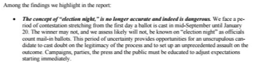 Got that? The very “concept of ‘election night’” is hereby pronounced defunct. Replacing it will be something called voting “contestation” that could last “until January 20th”. Expecting Election Night returns on Election Night — as we had expected such returns since the start of the broadcast-media age a hundred years before — was, suddenly in 2020, something not merely inaccurate but “dangerous”, something that might assist “an unscrupulous candidate” in drawing attention to questions of election legitimacy, and something about which the public must have its expectations “adjust[ed]…starting immediately”.