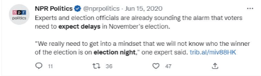 The adjustment started even earlier than immediately, since the reliable brainwash vector of National Public Radio had begun already in June, via proxy “experts and election officials”, to “sound the alarm” and urge listeners to “get into [the required] mindset”: