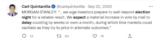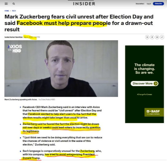 The furrowed eyebrows and curled lips of newspapers-of-record and The Atlantic, of course, among others, all got busy adjusting-public-expectations. Establishment social-media figure, Mark Zuckerberg adjusted-public-expectations in an early September 2020 interview, with a script containing the key Frum/Podesta message-elements, that “there’s nothing illegitimate about this election taking additional days, or even weeks, to make sure all the votes are counted” (you want all those votes counted, don’t you?!), and that Facebook would “do a bunch of different messaging around that just to make sure people know that that’s normal.”