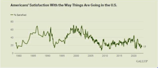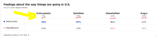 And to take us right up through Election Day itself, CNN ran an exit poll of voters who had just voted either in person or by mail. CNN asked, among other things, the same overall sentiment question, if people were happy with “the way things are going in the US”: 74% responded that they were either “dissatisfied” (41%) or even “angry” (33%), with just 5% “enthusiastic” (see chart below).